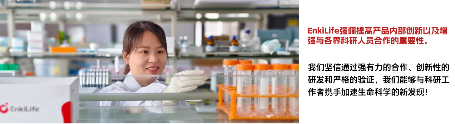 EnkiLife的产品线涵盖细胞系、原代细胞、细胞培养基、胎牛血清、细胞检测试剂盒、重组靶点蛋白、细胞因子、重组抗体、抗体标记试剂盒、WB试剂盒、IHC试剂盒、TSA试剂盒、ELISA试剂盒等,覆盖了生命科学研究的各大关键领域,包括细胞生物学、癌症、免疫学、神经科学、心血管疾病、干细胞、表观遗传学、内分泌、蛋白质组学、代谢组学等,全方位满足您的实验需求,让您享受科研的乐趣!