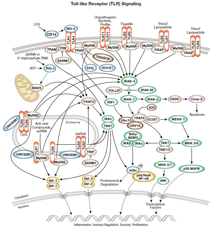 1、Toll样受体(TLRs):主要位于细胞表面或内体膜上,可识别病毒的核酸或蛋白质。例如,TLR3识别双链RNA病毒,TLR7和TLR8识别单链RNA病毒。