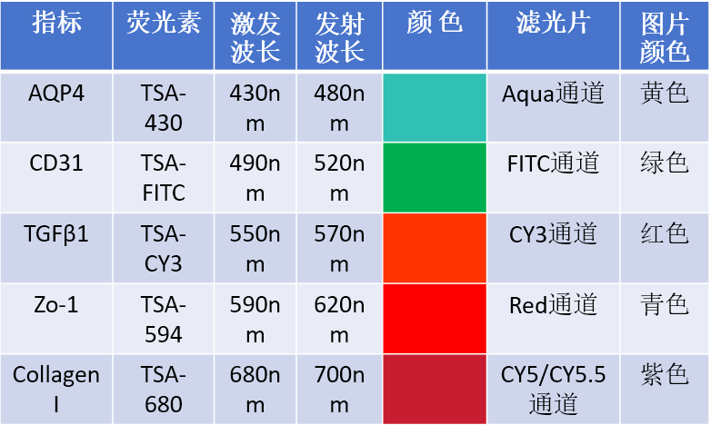 | 免疫荧光四标 | 不含一抗,含二抗(兔/小鼠/大鼠)、DAPI; 需要提供多余白片做单标预实验。例如:10例样本做5标,其中目的片子提供10张,另选择样本A提供5-10张白片,分别做5色的单标,预实验成功再进行正式实验 | |