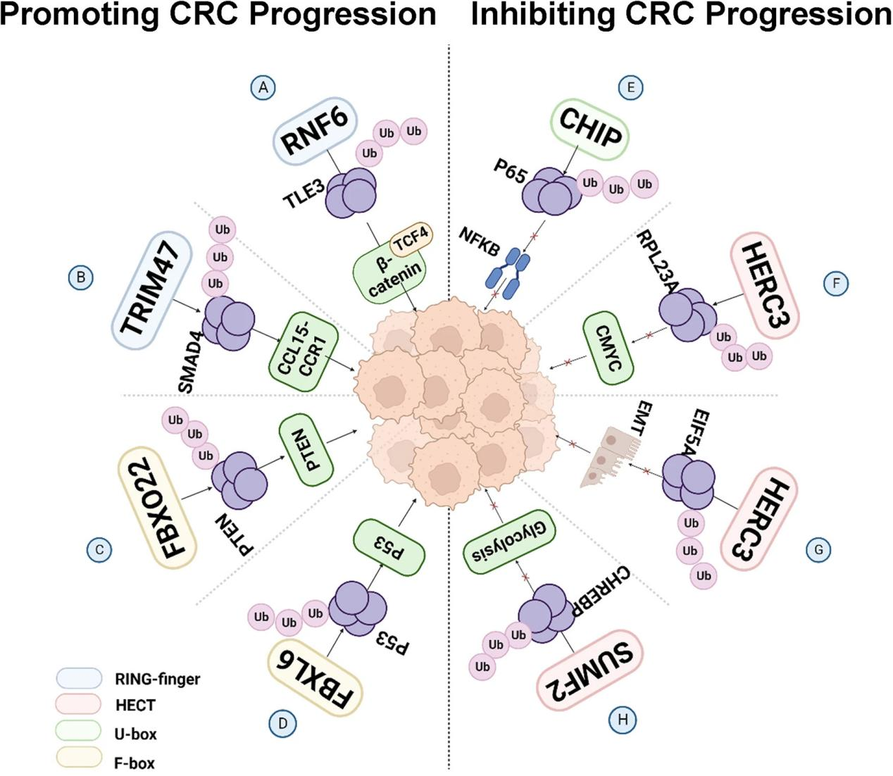 E3 泛素连接酶在结直肠癌的启动和进展中起着至关重要的作用,一些E3 泛素连接酶通过促进癌基因的降解作为肿瘤抑制因子,而另一些则通过抑制肿瘤抑制因子的降解或促进代谢开关的降解作为癌基因因子自身发挥作用(图2)。它们通过标记底物蛋白进行泛素化,并随后降解信号通路中的关键蛋白。通过调节泛素化和降解过程,E3 泛素连接酶可以作为肿瘤发生的促进剂或抑制剂[3]。