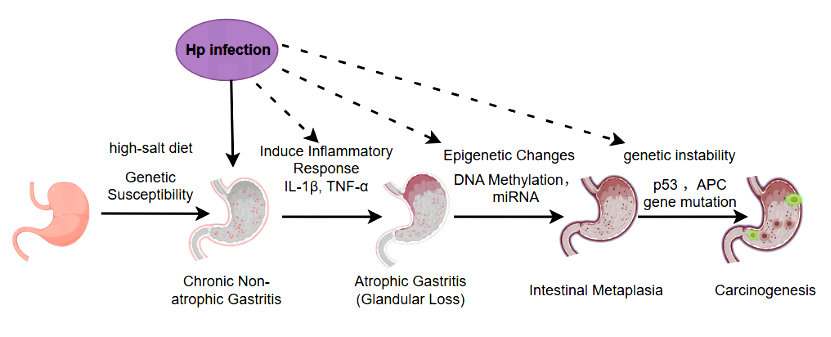 外部环境因素是胃腺癌发病的核心诱因,其中幽门螺杆菌(Hp)感染是最明确的 Ⅰ 类致癌因素(WHO 认定),其他因素通过协同或叠加作用加剧损伤,如长期摄入高盐饮食和遗传易感性[3]。