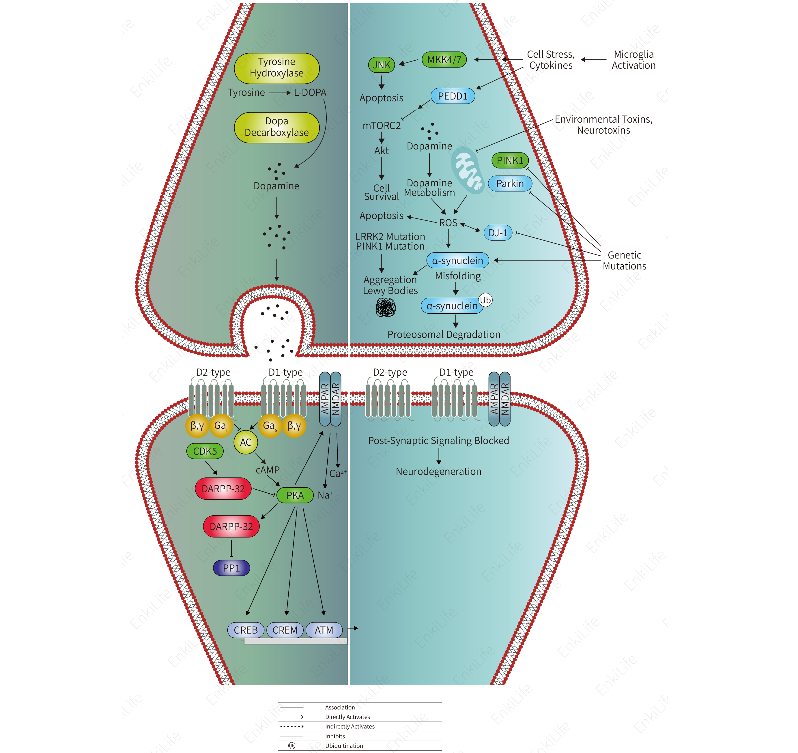 正常α- 突触核蛋白(α-synuclein, α-syn)是可溶性小分子蛋白,主要分布于突触前膜,参与突触囊泡释放和突触维持;而在 PD 中,α-syn 发生错误折叠(形成 β- 折叠结构),聚集成不溶性纤维,最终形成路易小体或者神经突。他们不仅会直接损伤神经元结构(如破坏突触功能),还会通过多种途径诱发细胞死亡(如抑制蛋白酶体活性、干扰线粒体功能、激活炎症反应等)[3]。