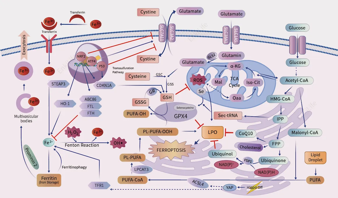 细胞铁死亡是一种新近发现的细胞程序性死亡形式,它依赖于二价铁离子,并涉及细胞膜上不饱和脂肪酸的高表达,导致细胞膜脂质过氧化和膜结构损伤。