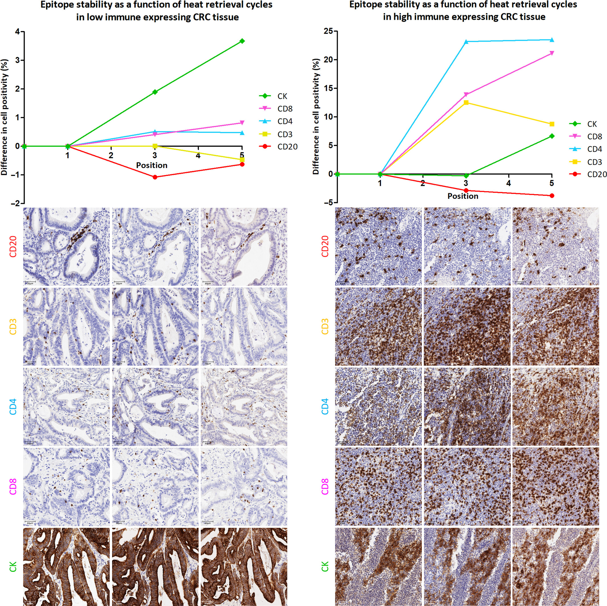 系统对比了低免疫浸润与高免疫浸润结直肠癌组织中,CD20、CD3等5种生物标志物在反复热诱导表位修复(HIER)后阳性细胞的检出率。