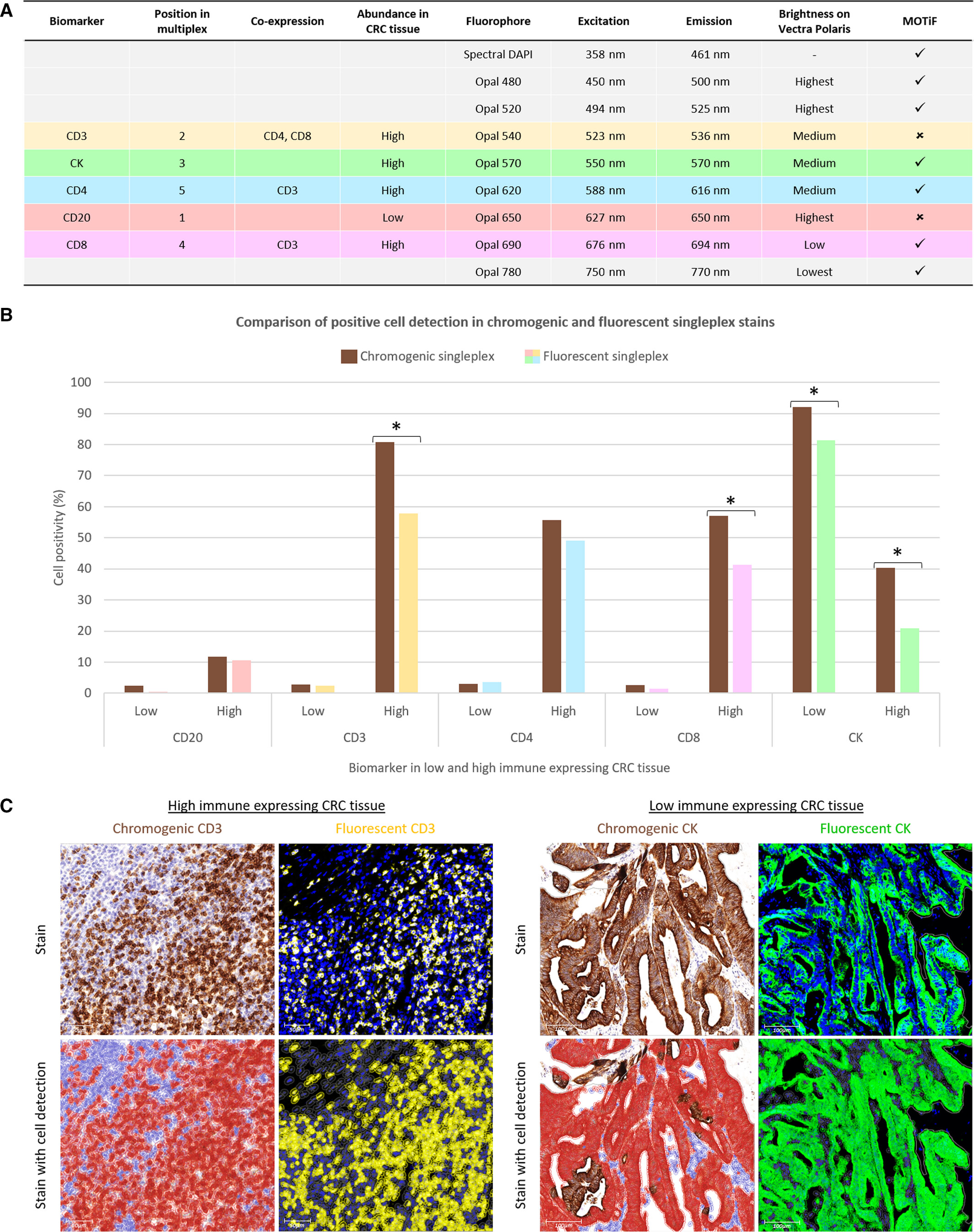 该实验通过三方面验证荧光单标技术的有效性:其一,依据抗体 - Opal 染料配对表,采用低丰度标志物(如 CD20)搭配高亮度染料、高丰度标志物(如 CD3、CK)搭配中低亮度染料的策略平衡信号强度,同时为功能相关标志物(如 CD3 与 CD4/CD8)选用光谱分离度高的染料以规避信号串扰;其二,柱状对比图显示,低 / 高免疫浸润结直肠癌组织中 5 种标志物的检测结果,在该技术与传统 DAB 显色免疫组化间高度一致;其三,代表性区域实拍图表明,传统 DAB 染色因细胞密集难以实现精准细胞分割,而荧光染色信号边界清晰,可借助软件准确判定细胞阴阳性。综上,荧光单标技术可替代传统免疫组化用于标志物检测,且在密集细胞区域的定量分析中更具优势,为后续多重荧光染色的可靠性提供了数据支撑。