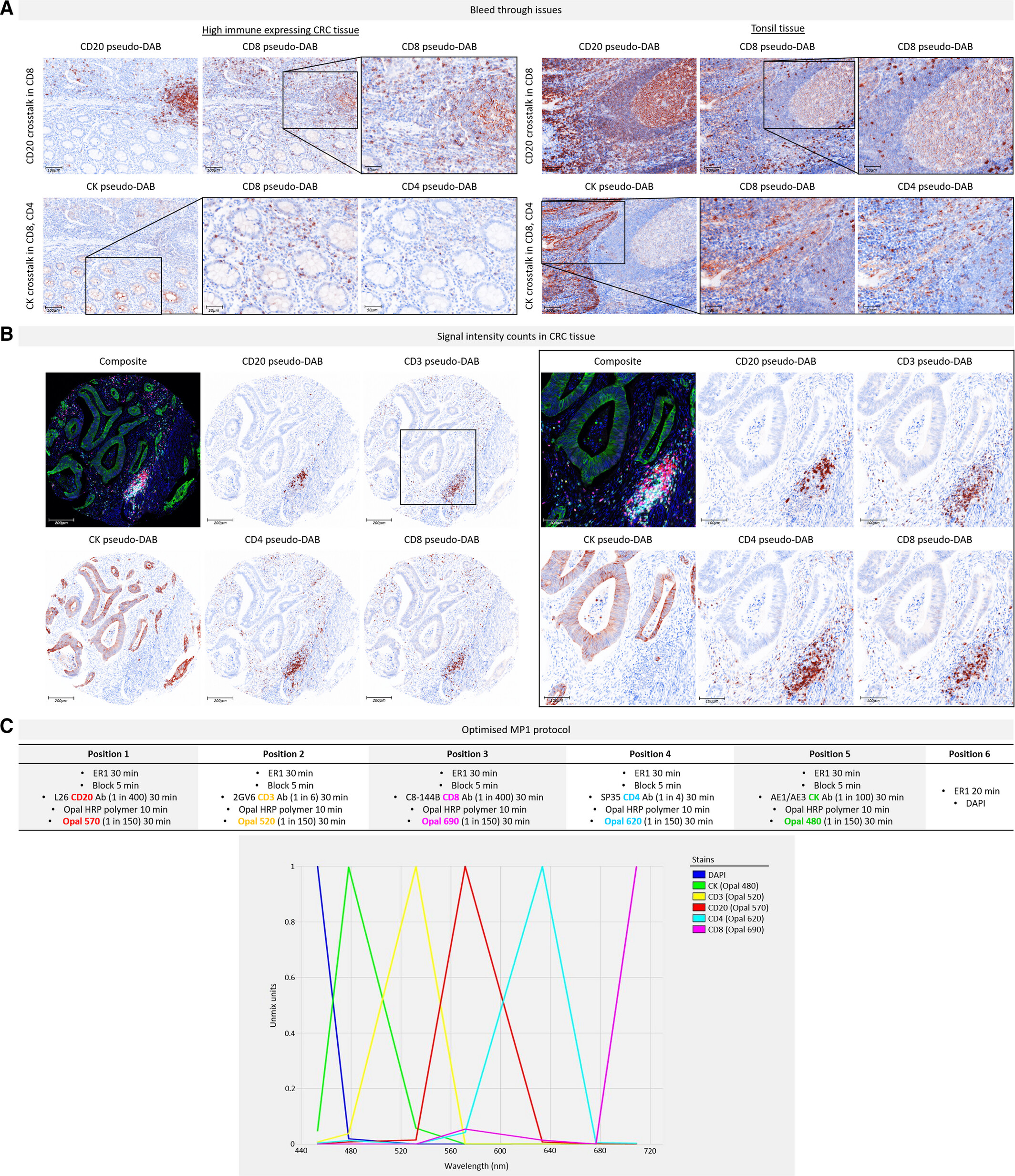 图 A 显示优化前 CD20 对 CD8、CK 对 CD4/CD8 存在明显信号干扰,其原因包括 CD20-Opal 650 与 CD8-Opal 690 同属 Cy5 通道引发光谱重叠,以及 CK 与 CD8 染色位置相邻导致的表位交叉反应,对照实验排除了抗体剥离不彻底的干扰。通过调整 Opal - 抗体配对、重排染色顺序(避免 CK 与 CD4/CD8 紧邻)、采用 ER1 温和剥离液等优化措施,信号串扰被完全消除。优化后图 B 中各标志物信号强度处于 20-25 计数的最优区间,所用 MOTIF Opal 染料无光谱重叠且扫描速度提升 20 倍,可满足高通量样本分析需求。