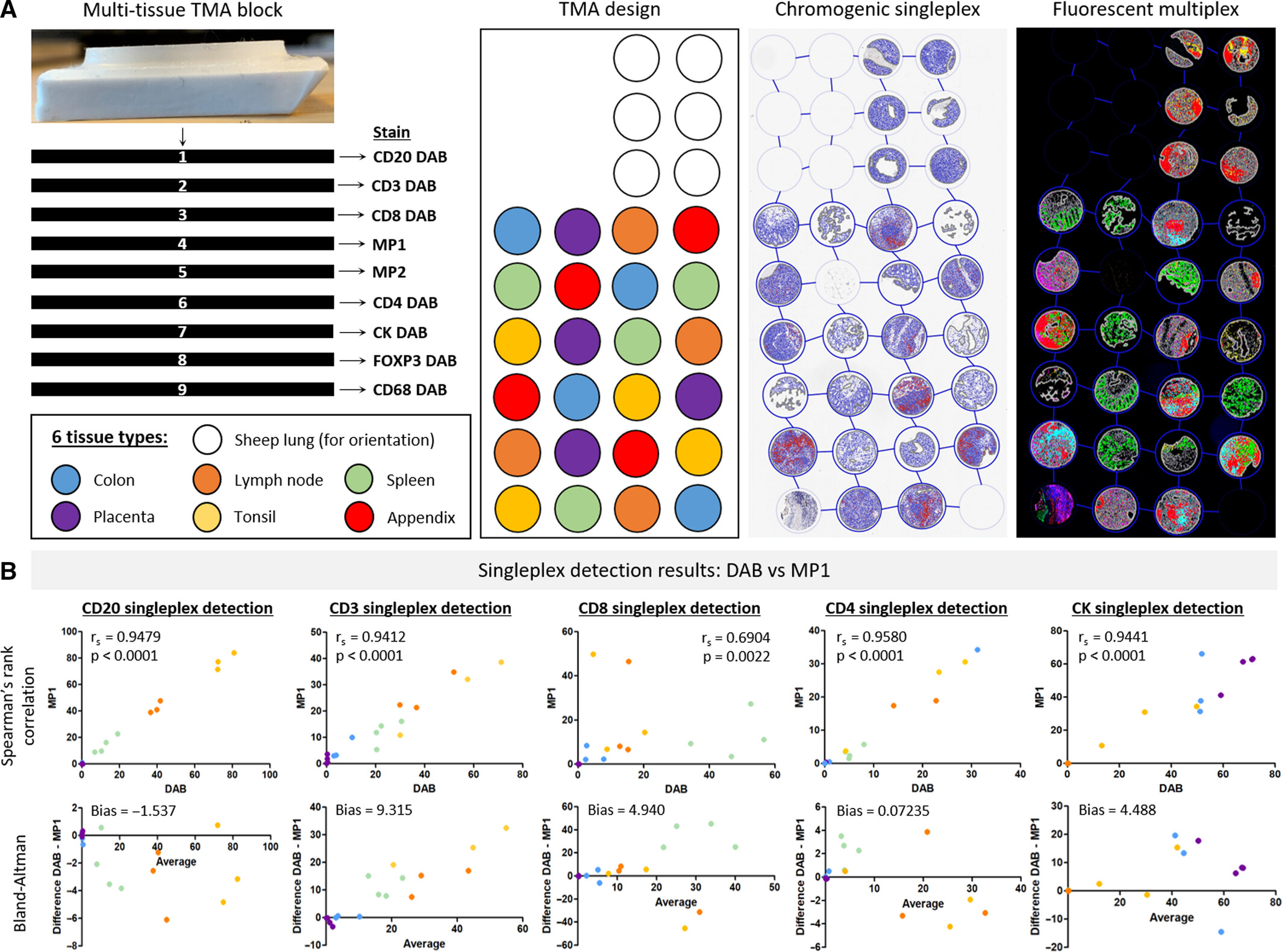 图A展示 9 张连续切片的处理方案(7 张用于传统 DAB 单标免疫组化、2 张用于多重荧光染色)及芯片布局(含 6 种正常组织与羊肺定位组织),B 通过 Spearman 相关分析与 Bland-Altman 一致性分析,系统对比各标志物在两种检测方法中的检出结果。检测结果显示,除 CD8(部分组织表位不稳定)与 FOXP3(表达量<0.5%)外,其余标志物两种检测方法的相关系数 rₛ均>0.9(P<0.0001),且所有标志物检测偏差均处于 95% 一致性界限内,证实多重荧光染色无系统性偏差,与传统免疫组化具有高度一致性与良好相关性。该图作为核心验证数据,从多组织类型、多标志物及定量一致性三个维度,确证了 MP1 与 MP2 实验流程的可靠性。