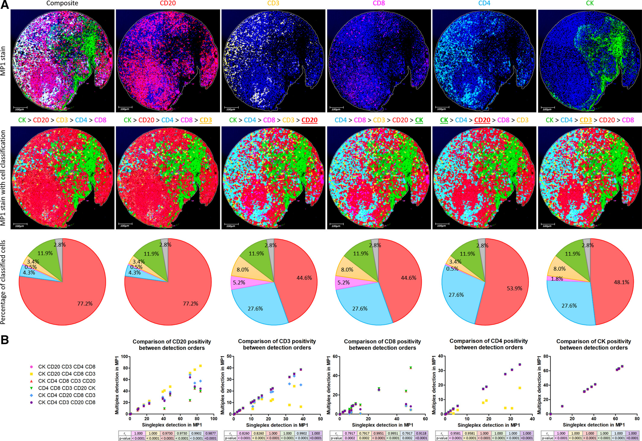 图A为扁桃体组织芯片的 MP1 染色图,同步呈现 6 种检测顺序下的表型分类饼图、原始染色图及细胞分类图。散点图量化对比不同检测顺序与单标结果的相关性。研究发现,检测顺序对分析结果存在显著影响,优先检测高表达标志物CD20会掩盖邻近低表达标志物CD8的信号,造成 CD20 阳性率高估、CD8 阳性率低估。最终确立的 “CK>CD4>CD3>CD20>CD8” 最优检测顺序,遵循 “先非免疫细胞标志物、后按泛免疫细胞→T 细胞亚群→B 细胞层级,且将易串扰标志物后置” 的逻辑,其表型分类结果与原始染色高度吻合,且各标志物分析结果与单标结果的相关性达到 rₛ>0.9(P<0.0001)。该图首次阐明检测顺序在多重荧光数字分析中的核心作用,建立基于细胞类型层级的检测顺序原则,有效解决分析方法不当引发的表型分类错误。