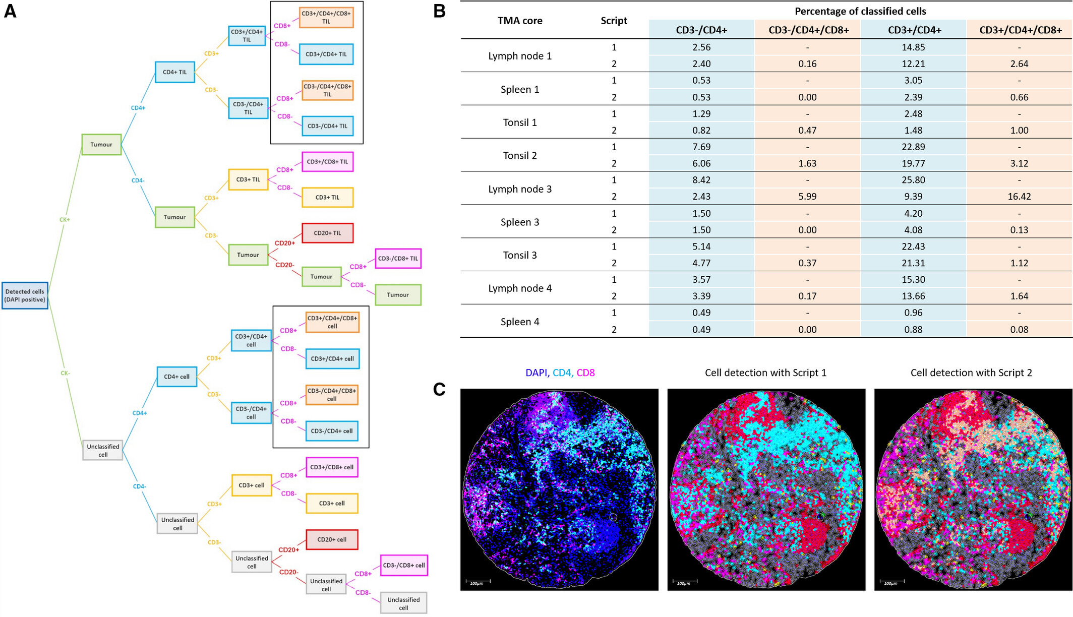 该分类决策树遵循 “细胞核识别→CK 阴性筛选→CD3 分型→CD4/CD8 细分”的层级化逻辑,保障细胞定义的清晰性。研究通过定制分析脚本实现预期表型与意外表型的全面覆盖,解决了数字分析中的表型漏判问题,新发现的 CD4⁺/CD8⁺双阳性细胞亚群为结直肠癌免疫微环境研究提供了新线索,凸显了多重荧光染色技术在挖掘新型生物标志物方面的独特优势。