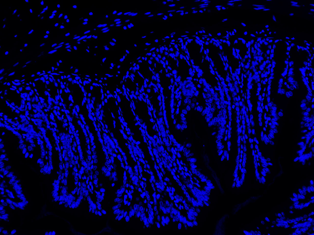 Hoechst 33342,也称bisBenzimide H33342或HOE 33342,是一种非嵌入性的亮蓝色荧光染料。染料在溶液中荧光较弱,它们在活细胞中 DNA聚AT序列富集区域的小沟处与DNA结合后荧光变得明亮,故此类染料也被称为DNA探针。因背景较低,故染色细胞不需洗涤步骤,且染色非常稳定,对活细胞无毒,结合DNA染色后可持续几天或更长时间。Hoechst 33342与Hoechst 33258相比在水中的溶解度要低,但两种染料均具有高细胞膜渗透性,被广泛用于细胞凋亡检测,染色后可用荧光显微镜观察或流式细胞仪检测。