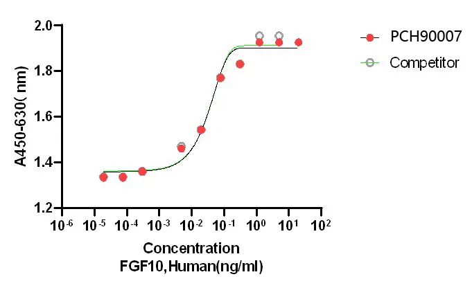 Fibroblast growth factor 10 (FGF-10, KGF-2), is a member of the fibroblast growth factor (FGF) family that includes FGF-3, -7, and -22. KGF-2 is secreted by mesenchymal cells and associates with extracellular FGF-BP. It preferentially binds and activates epithelial cell FGFR2 and interacts more weakly with FGFR1. It plays an important role in the regulation of embryonic development, cell proliferation and cell differentiation. It exhibits mitogenic activity for keratinizing epidermal cells, but essentially no activity for fibroblasts, which is similar to the biological activity of FGF7. FGF10 is required for normal branching morphogenesis. Defects in FGF10 are the cause of autosomal dominant aplasia of lacrimal and salivary glands (ALSG). ALSG has variable expressivity, and affected individuals may have aplasia or hypoplasia of the lacrimal, parotid, submandibular and sublingual glands and absence of the lacrimal puncta. The disorder is characterized by irritable eyes, recurrent eye infections, epiphora (constant tearing) and xerostomia (dryness of the mouth), which increases the risk of dental erosion, dental caries, periodontal disease and oral infections.