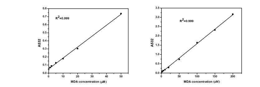 本试剂盒可以测定1-200μM范围内的MDA,下图展示了MDA标准品不同浓度检测的A532读数。