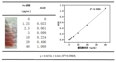 植物体内的氨基酸只有脯氨酸(Pro)能与酸性茚三酮发生反应,生成稳定的红色产物(如下图)。该产物在520nm波长处有一最大吸收峰,其吸收值与脯氨酸的含量呈线性关系。因此,样本中的脯氨酸含量可用酸性茚三酮法测定。