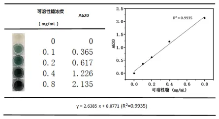 糖类和蒽酮反应生成有色物质,该物质在 620 nm处有最大吸收峰,可通过测定吸光度值大小来判断可溶性糖含量。以下标准曲线仅供参考: