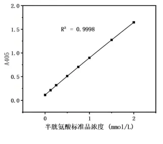 半胱氨酸还原磷钨酸DTNB生成TNB,在 405 nm 处有吸收峰,通过测定 405 nm 处的吸光度值,可计算出半胱氨酸的含量。