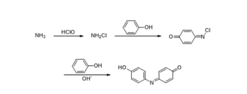 用蛋白沉淀剂沉淀血液蛋白质,并破坏酶活性,防止离体后产生游离氨,同时除去大部分干扰显色物质,用 Berthelot 反应使无蛋白滤液中形成靛蓝,颜色深浅与血氨含量成正比,与标准液比较测定血液氨含量。其检测原理如下图: