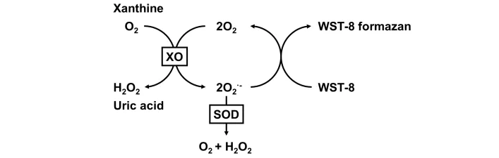 WST-8可以和黄嘌呤氧化酶(Xanthine Oxidase, XO)催化产生的超氧化物阴离子(O2-)反应产生水溶性的甲臜染料(formazan dye)。由于SOD能催化超氧化物阴离子发生歧化作用,所以该反应步骤可以被SOD所抑制,因此SOD的活性与甲臜染料的生成量成负相关,从而通过对WST-8产物的比色分析即可计算SOD的酶活力。本试剂盒的原理图如下所示: