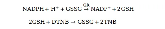 谷胱甘肽还原酶可以还原氧化型谷胱甘肽(GSSG)生成还原型谷胱甘肽(GSH),而GSH可以和生色底物DTNB反应产生黄色的TNB和GSSG,并可以通过测定A412来检测TNB的生成量。适当设置应体系,前后两个反应合并起来后, GSSG/GSH过量而GR相对不足时,该反应体系中谷胱甘肽还原酶就成为整个反应体系的限速因素,此时黄色的TNB生成量和谷胱甘肽还原酶的活性呈线性正相关。从而通过测定A412就可以计算出谷胱甘肽还原酶的活性水平。本试剂盒的具体反应原理如下: