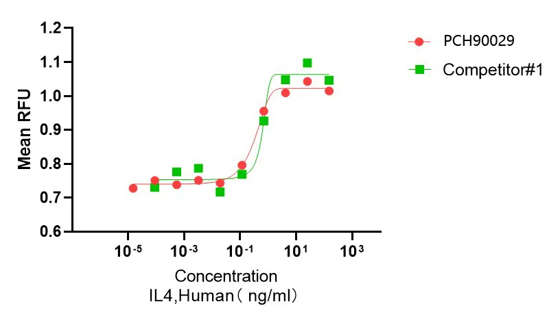 Interleukin-4 (IL-4) is a pleiotropic cytokine that regulates diverse T and B cell responses including cell proliferation, survival and gene expression. IL-4 is produced by mast cells, T cells, and bone marrow stromal cells. IL-4 regulates the differentiation of naive CD4+ T cells into helper Th2 cells, characterized by their cytokine-secretion profile that includes secretion of IL-4, IL-5, IL-6, IL-10, and IL-13, which favor a humoral immune response. Another dominant function of IL-4 is the regulation of immunoglobulin class switching to the IgG1 and IgE isotypes. Excessive IL-4 production by Th2 cells has been associated with elevated IgE production and allergic response.